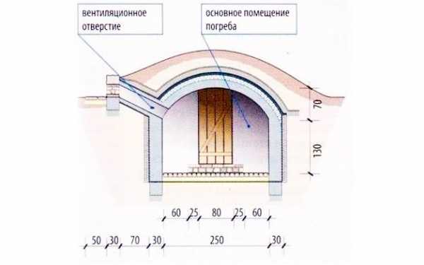 Не упустите важный момент – устройство вентиляции. Если установить две трубы на разных уровнях конструкции – вверху (на расстоянии 100-150 мм от потолка) и внизу (на 400-500 мм выше пола), то они будут способствовать лучшей циркуляции воздуха внутри погреба. Можно использовать одну трубу, тогда через нее воздух будет и попадать в помещение, и извлекаться из него. такой способ работает слабее.