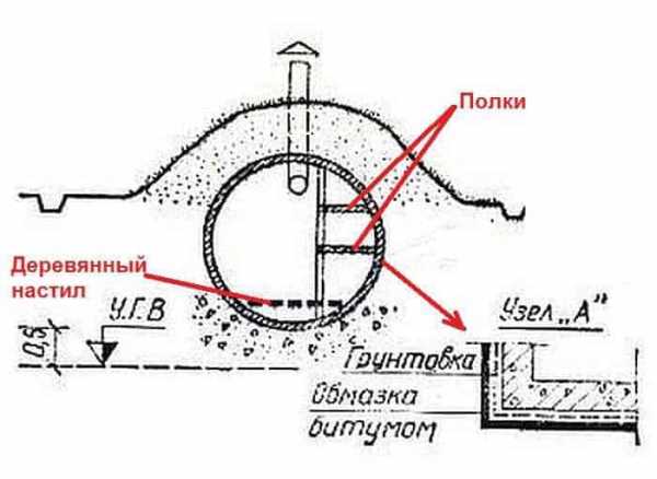 Не на каждом участке можно заглубить погреб на 2 м и не встретиться с грунтовыми водами. На некоторых территориях можно найти грунтовые воды уже на глубине 60-80 см. При таких условиях погреб выполняется мелкозаглубленным. Конструкция монтируется на ту глубину, где нет почвенных вод. Верхняя часть при этом надежно теплоизолируется.