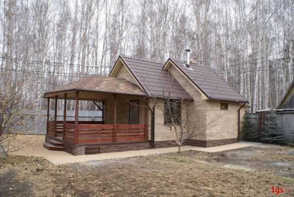 Имеет теплый санитарный узел, помывочную, парную и комнату отдыха. Размеры 5×9,38 метра. Материал бани – пеноблоки, внешняя отделка стен – цементно-песчаная штукатурка.