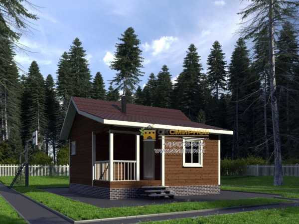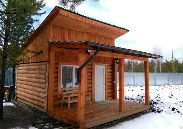 Самый бюджетный вариант бани — сборная конструкция из бруса под односкатной кровлей из Ондулина. Такая банька, как на фото, — это постройка с маленькой парной и достаточно вместительной зоной отдыха на открытом воздухе.