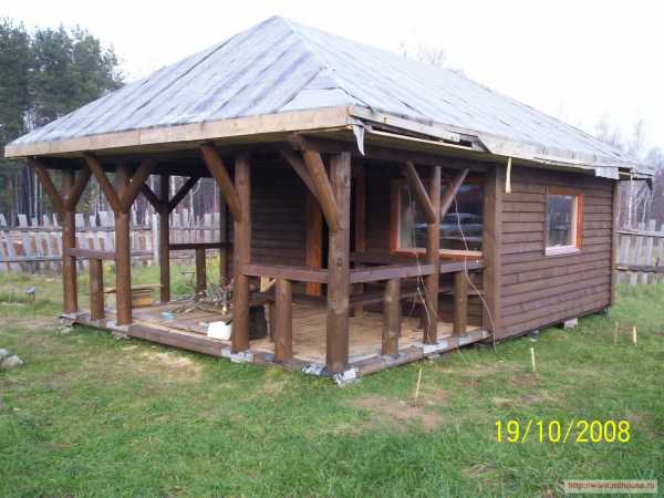 Можно без проблем подобрать недорогой сруб, разобрать его и построить полноценную баню с беседкой под одной кровлей (её из брёвен сделать не получится, если что 🙂 ).