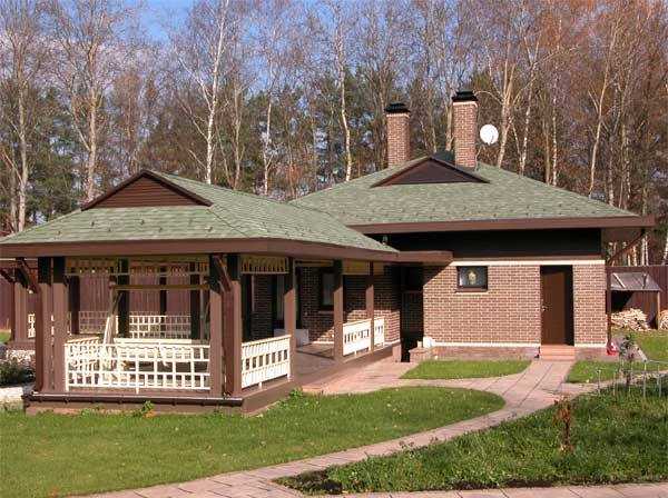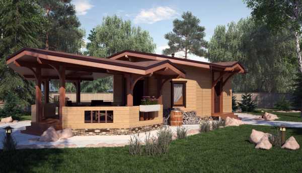 Красивы по архитектуре одноэтажные брусовые бани с верандой или беседкой под двускатной крышей из гибкой черепицы. Особенно колоритно смотрятся фасады из бруса, окрашенного в светлые тона и скомбинированного с темным кровельным покрытием.
