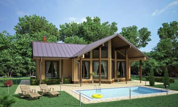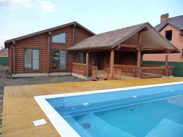 Просторная баня из дерева с беседкой под одной крышей станет еще комфортнее для отдыха, если к зданию будет примыкать бассейн. А чтобы облегчить переход из бани к бассейну, пол в беседке и настил вокруг бассейна укладывают в одном уровне, например, террасной доской.