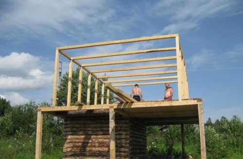 Далее собирают обрешетку. Для этого пригодится брус с сечением 50 на150 мм. Шаг укладки обрешетки зависит от того, какой тип кровельного материала предполагается использовать.