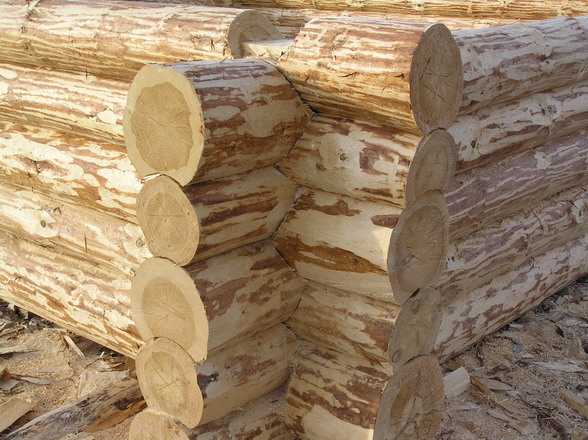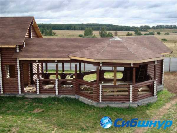 Основной материал строительства, это оцилиндрованные бревна крыша в данном проекте стоит на отдельных стойках, а стропильная система здесь единая.