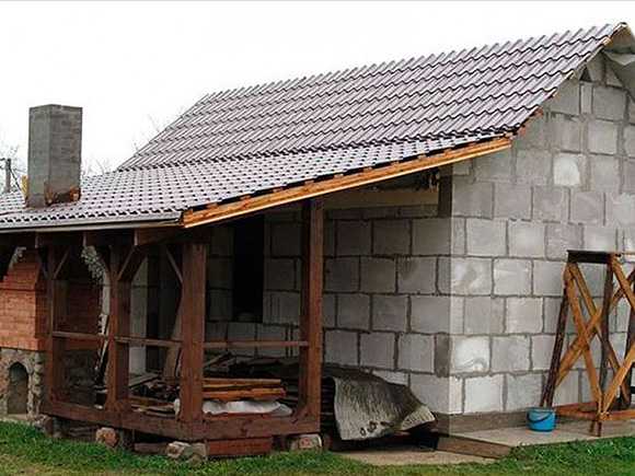 - Теперь можно возвести крышу. Это нужно сделать так, чтобы она имела цельную конструкцию. Идеально подойдёт двускатная или четырёхскатная крыша. Надёжность конструкции во многом зависит от правильности расчёта высоты. Необходимо обустроить два отдельных дымохода. Заранее нужно позаботиться о системе водостока и держателей снега. Кровельный материал можно использовать абсолютно любой. Если подходить к вопросу со стороны экономичности, лучше выбирать металлочерепицу или оцинкованный профиль.