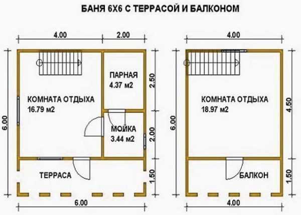 Размер 6*6 м дает пространство для фантазии. В проект такой бани можно включить такие помещения: