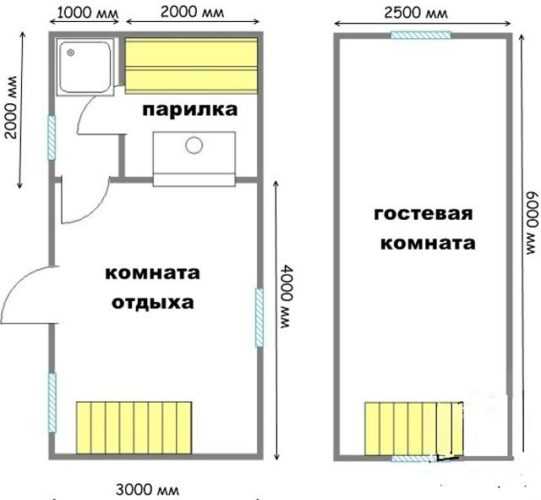 Вынос террасы за фундамент основного строения позволит выделить небольшое пространство от комнаты отдыха для тамбура. Тогда возможно попариться и в зимнее время. Примерные размеры внутренних помещений: