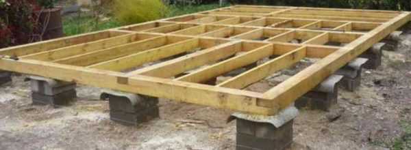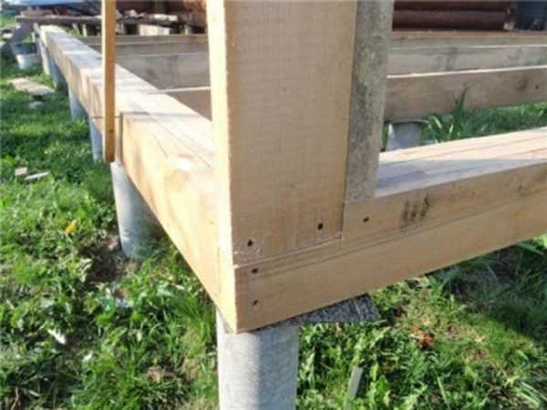 - После того как будут поставлены столбы необходимо сделать железобетонный ростверк, его сверху накрываем гидроизоляцией – слой рубероида. На готовый ростверк кладём лаги под незначительным уклоном – для чернового пола. Уклон необходим для обеспечения свободного стока воды.