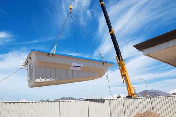 Одним из наиболее ответственных этапов считается проведение сборочных работ по установке и подключению всех элементов бассейнового хозяйства. Малогабаритные бассейны из акрила устанавливают в построенную из кирпича ячейку подъемным краном.