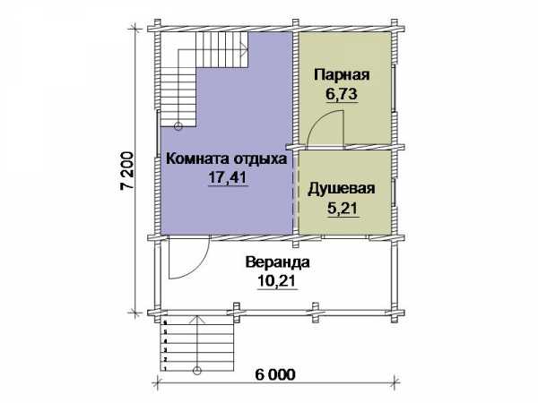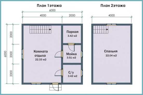 Если же планировка 6х6 м разрабатывается в угоду внутреннему обустройству, тогда места хватит на то, чтобы на нижнем этаже отделить просторную комнату отдыха от входного коридорчика, предусмотреть отсек для хранения дров, туалет или даже смонтировать в моечной комнате объёмную купель по типу мини-бассейна. Мансарда в бане зонируется на достаточно комфортные гостевые комнаты, для организации тренажерного зала, домашнего кинозала или иные целевые помещения.