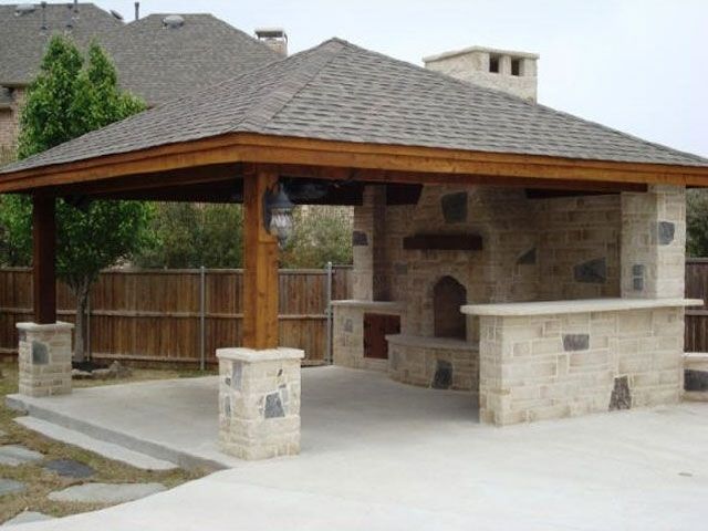 Вариант беседки из известняка и крыши из дерева- огнеупорность;