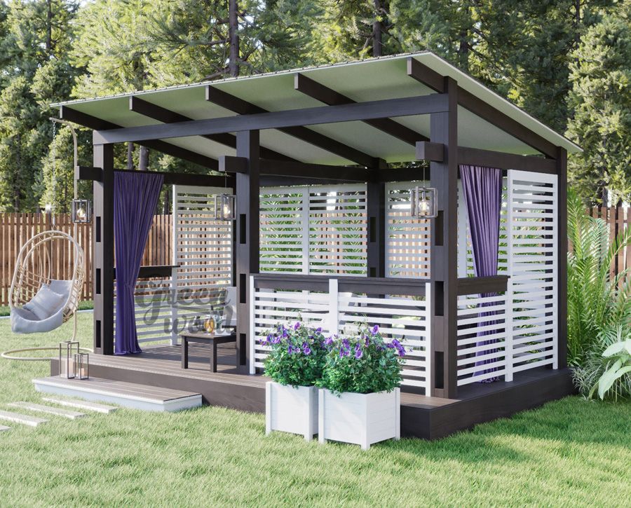 Они также декорируются деревянными решетками и балясинами, а крыша у них может быть выполнена как сплошной навес или в виде перголы.