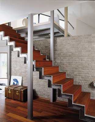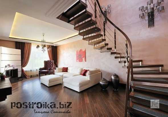 Выбор конструкции зависит и от дизайнерской концепции проекта. В классических интерьерах чаще применяются прямые марши или винтовые, современных стилях — хай-тек, минимализм, лофт — чащеиспользуются прямые и дугообразные без подступенков на тетивах.