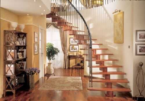 Если помещение, в котором планируется установка лестницы слишком мало, а высота второго этажа значительна, можно установить винтовую. Ее преимущество в том, что она занимает меньше всего полезной площади помещения и выглядит очень декоративно. Правда, в эксплуатации эта конструкция не так удобна: её ширина обычно менее 1 м, а спиральныйподъем не позволяет перемещать по ней крупногабаритные предметы.