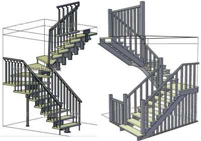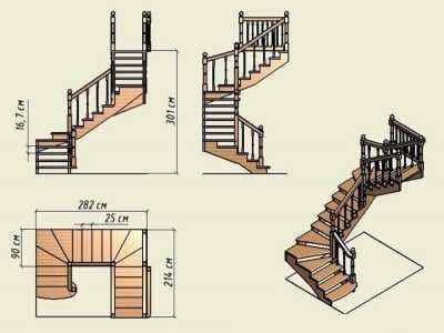 Однако ограниченность пространства зачастую заставляет искать альтернативные компактные в площади варианты, устанавливать сложные винтовые лестницы: чертежи их с забежными ступенями можно «вписать» практически в любой проект. Сооружение с двумя маршами займет больше пространства, чем винтовой вариант, но меньше, чем простой пологий аналог. В его проекте могут быть, как забежные ступени, так и площадка между маршами.