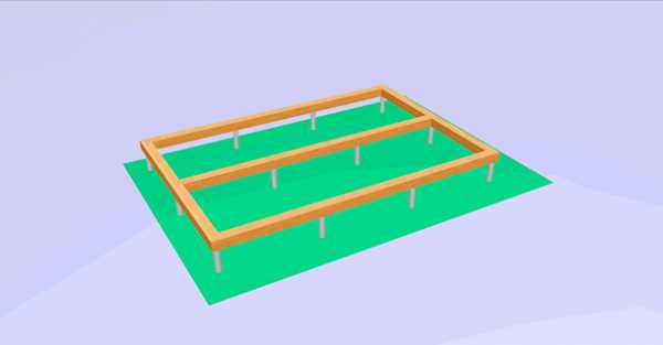 За обвязкой следуют лаги. Это та же «пятидесятка» шириной в 20 см и длиной в нашем случае 3,9 м. Разложите их на ростверке параллельно короткой стороне времянки с шагом в 41 см. Вновь зафиксируйте все гвоздями, прибивая доски не только к ростверку, но и к обвязке.