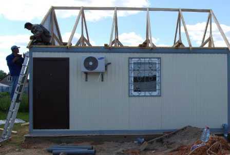 Процесс монтажа крыши на вагончик из контейнераУ каждого из них доступная цена. Однако более эстетично смотрится металлочерепица. Укладывать современный материал нетрудно. Завершив кровельные работы, необходимо произвести пароизоляцию, гидроизоляцию и теплоизоляцию потолка. Применяются листы ДВП или ламинированный ДСП. Не следует выбирать для крыши стальные листы. Этот материал отлично защищает от атмосферных осадков, однако, у него недостаточно хорошая звукоизоляция. Крыша будет громыхать во время дождя.