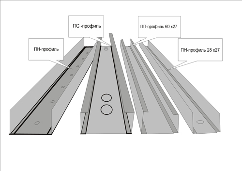 Все профиля для каркасов под обшивку гипсокартоном можно свести к 4 основным видам: направляющий (маркировка ПН), потолочный направляющий (ППН), потолочный (ПП) и стоечный (ПС). А теперь поподробнее о них.