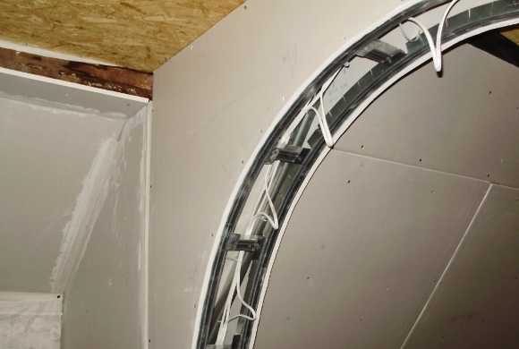 Каркас из профиля под гипсокартон не всегда имеет прямые участки. Для радиусных стен, проемов создан арочный профиль 4 м, 3,1 м, 2,6 м длиной. Вогнутые профили могут применяться для радиусов 5 – 0,5 м, выпуклые для 5 – 1 м. На боковых полках тонкостенного швеллера в этом случае создаются дополнительные ребра жесткости, насечки, обеспечивающие гибкость изделия.