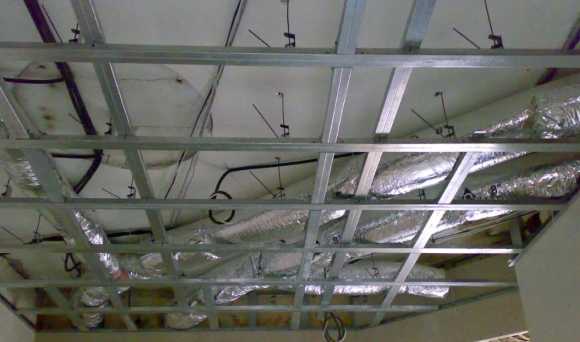 - крепление стоек – несущий профиль обрезается в размер высоты помещения, размещается внутри двух направляющих, вертикальность каждого участка обеспечивается по умолчанию, фиксируется к стене подвесами