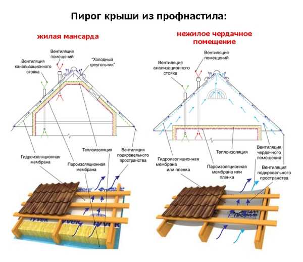 Как и при возведении крыши из любого материала, перед установкой профнастила необходимо соорудить кровельный пирог. Он не отличается от конструкций для других типов крыш. Также вначале на обрешетку стропильной системы (как ее делать, читаем тут) укладывается слой пароизоляции, затем утеплитель и гидроизоляция. Необходимо предусмотреть и вентиляция для крыши, чтобы избежать скапливания конденсата. Поверх гидроизоляции монтируется контробрешетка толщиной примерно 2-3 см для обеспечения вентиляции, и на нее уже крепится профнастил.