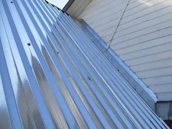 - Примыкание к стенам (если они имеются) осуществляется с помощью угловой планки – для нее в стене делается специальный паз. Крепится она и к профнастилу, и к стене.