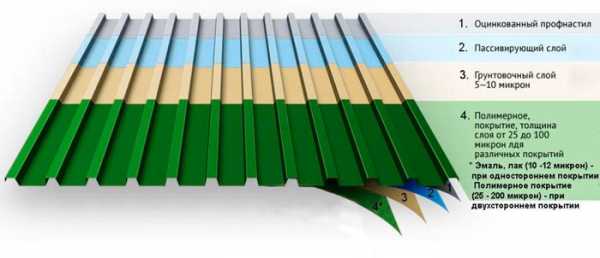 Самым недорогим по стоимости считается покрытие профнастила из цинка, но оно одновременно и самое недолговечное. Более прочный защитный слой делают из соединения алюминия с кремнием (прочтите ещё статью: «Кровельный металлопрофиль — разновидности материала»). Долговечный вариант – покрытие их полиэстера, тем более что оно представлено на рынке в широкой цветовой гамме. Добавление тефлона в полиэстер делает защитный слой прочнее. Надежным являются покрытия из ПВДФ и из смеси ПВХ и разных добавок.kryshadoma.com