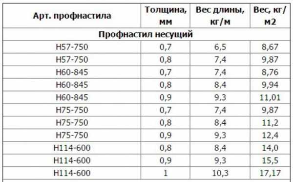 От толщины профнастила зависит и вес. Для кровли этот параметр очень важен. От него будет напрямую зависеть сечение стропил и толщина досок обрешетки для профлиста. Самый тонкий вид материала (с параметрами в 0,4 миллиметра) имеет вес 3,87 килограмма на квадратный метр. Более толстый профнастил весит больше. Так самый «мощный» вид с маркировкой Н840 имеет массу квадратного метра в 21,52. Такой материал трудно использовать для кровли, он больше подойдет для создания стен отдельно стоящих строений.