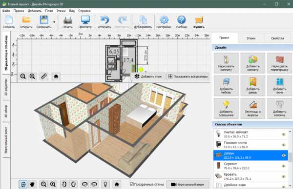 Одна из самых удобных и востребованных программ. С помощью нее можно осуществить целый комплекс работ по планировке квартиры. Огромными преимуществами данного софта является его полная доступность – это бесплатная программа, а также поддержка русскоязычного пакета.