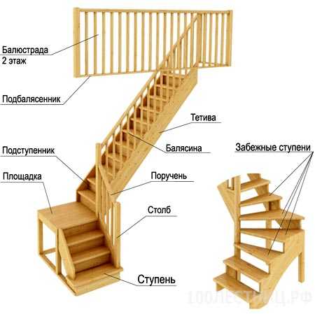 Название элементов лестницы с забежными ступенямиНередко такое решение применяют для оформления плавного захода на прямой участок подъема с поворотом на 90 градусов.