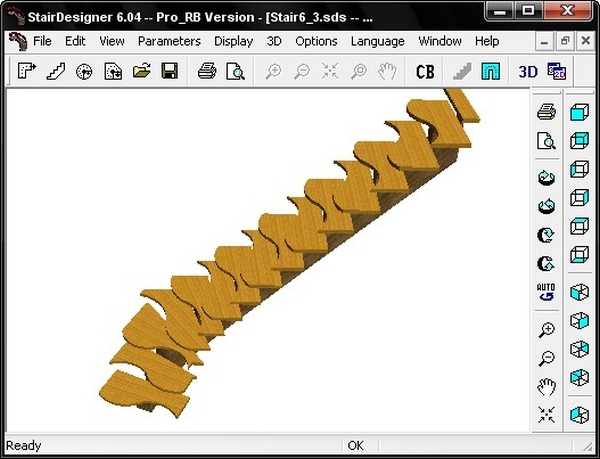 Готовый проект лестницы составленный в программе StairDesigner 5.08a PROПри достижении нужного результата параметры полученной модели фиксируются программными средствами и используются для формирования общих отчётов по проекту. Надо отметить, что вычисление параметров нестандартных лестничных моделей с применением программы проектирования StairDesigner 5.08a PRO требует внимательности и практики моделирования. Изучение возможностей программы путём составления пробных проектов обеспечит в дальнейшем возможность создания сложных моделей с минимально затраченным временем.