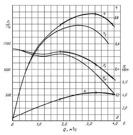 Вентиляторы с промежуточными размерами имеют показатели энергоэффективности, отвечающие положению верхней кривой. Во время расчетов используются показатели по производительности, полному, динамическому и статическому давлению и потребляемой мощности электродвигателя.