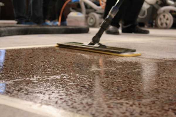 - Подготовка поверхности. Прежде чем будет нанесена пропитка для бетона, покрытия очищаются от старой облицовки, производится влажная уборка содовым раствором в концентрации 30 мл соды на 10 литров воды. Это позволяет тщательней убрать грязь, если пол пылил.