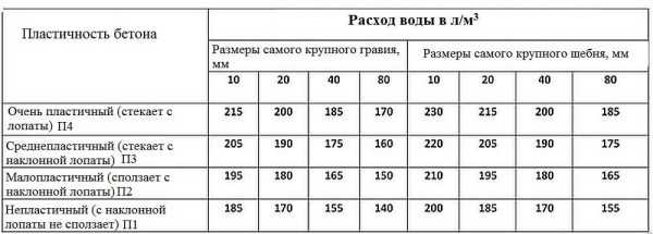 Количество воды в бетоне в зависимости от размеров щебня /гравия и текучести раствора