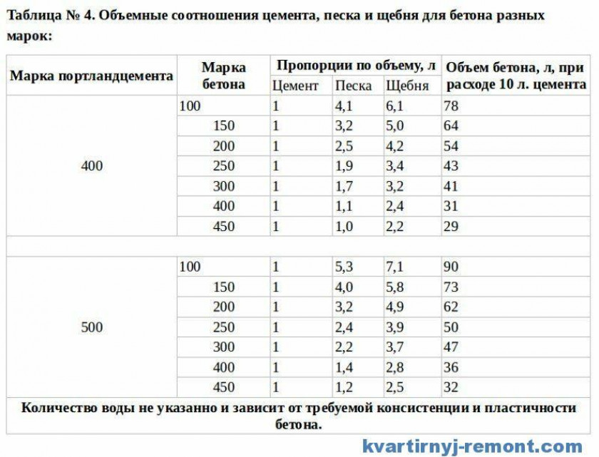 • для М-300 портландцемента ПЦ400-ПЦ500 — 380 кг, песка — 0,45 м³, щебня — 0,8 м³, воды 180 л