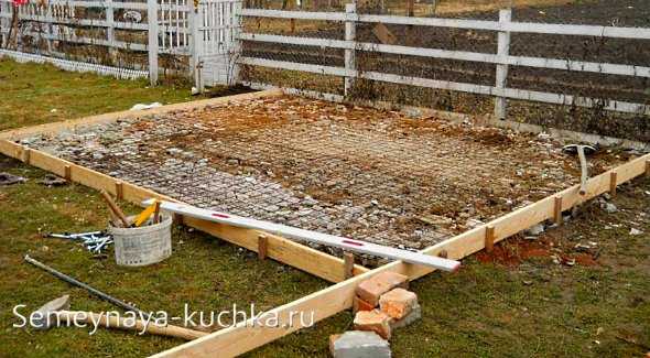 Перед началом работ нужно сделать подробный чертеж, после чего выбрать для постройки подходящее место на дачном участке. Затем нам придется срезать растительный слой на глубину 10-15 см, одновременно выравнивая площадку для бетонирования.