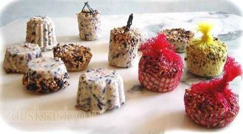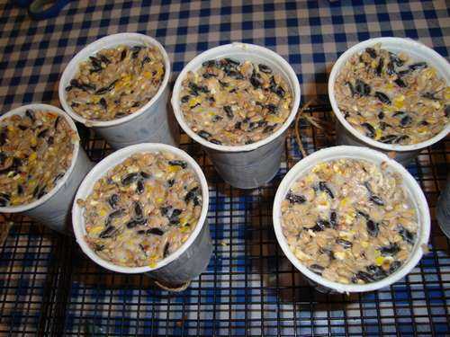 Раздробить в ступке арбузные семечки, крупы, кукурузные зерна, зерна пшеницы, перемешать с семечками подсолнечника, разложить по формочкам, вложив туда веревочку, за которую потом можно будет подвесить угощение и залить растопленным салом. Дать застыть на морозе.