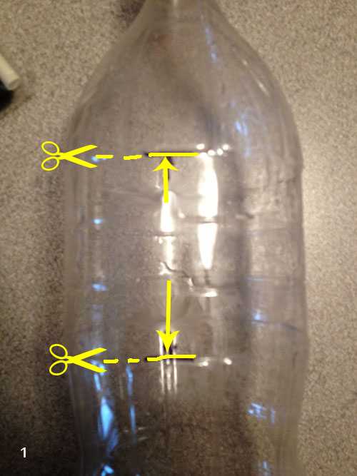 Для изготовления такой кормушки нужно взять две бутылки одинакового объема. Одну бутылку перед разрезанием размечаем маркером. На ней нужно около дна вырезать отверстия, чтобы птицы смогли клевать корм. Мысленно делим бутылку на три части и одну верхнюю часть срезаем полностью, а чуть ниже делаем параллельные друг другу отверстия для веревки.