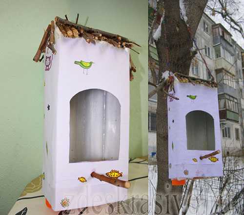- Было стойким к атмосферным осадкам. Часто можно видеть небольшие кормушки из пакетов от сока или обувных коробок, но такое изделие долго не прослужит, так как дождь или снег его в скором времени приведет в негодное состояние. Если все же нет другого материала кроме картона, нужно обклеить сделанную конструкцию скотчем, так она будет немного прочней и выдержит неблагоприятные погодные условия.