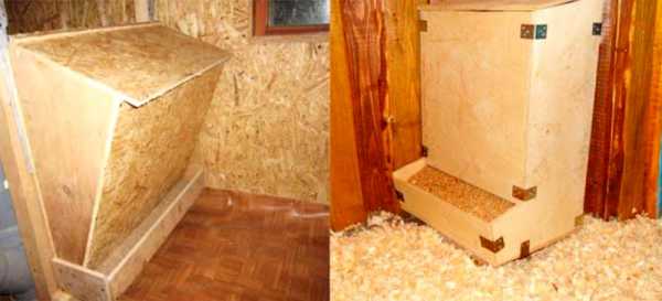 Первым вариантом станет изделие бункерного типа. Его конструкция интересна тем, что корм будет высыпаться сам по мере съедания его птицами.