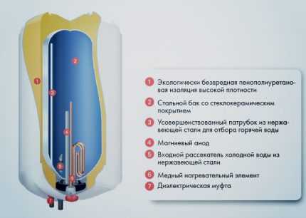 - Теплоизоляция. Предотвращает тепловые потери. Чем толще ее слой, тем дольше поддерживается оптимальная температура воды внутри, устройство более эффективно выполняет функцию термоса, а его эксплуатация обходится дешевле.