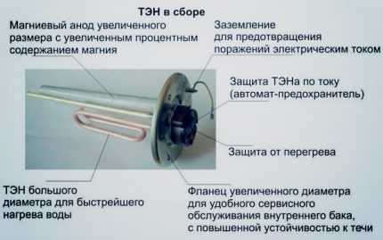 «Мокрый» медный ТЭН — это что-то наподобие кипятильника, он быстро покрывается накипью, понижающей его теплопроводность. Облегчает борьбу, с осевшими на поверхности нагревательного элемента солями кальция, «жертвенный» магниевый анод, работающий по принципу гальванического взаимодействия проводников. Более электроотрицательный магний принимает на себя ионы кислорода, препятствуя тем самым разрушению железа.