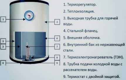 Конструкцию, состоящую из бака с ТЭНом внутри, нагревающим постепенно весь объем, находящейся в емкости воды, называют накопительным водонагревателем. Если рассматривать более подробную схему, то в ней присутствуют следующие элементы: