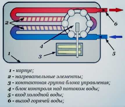 Холодная вода, поступая в проточный водонагреватель, должна пройти через специальное устройство для выравнивания давления, скорости потока и насыщения воздухом. Далее она проходит через теплообменник, где нагревается и идет на выход