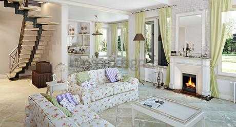 Мебель с красивой цветочной обивкой или в полоску отличный выбор для стиля прованс. Вся мебель должна быть красиво оформлена – диван дополнен подушечками с рюшами, стол накрыт льняной скатертью и салфетками, возле кресла положен сделанный вручную коврик. Комната, обустроенная камином, придаст стилю изюминку.