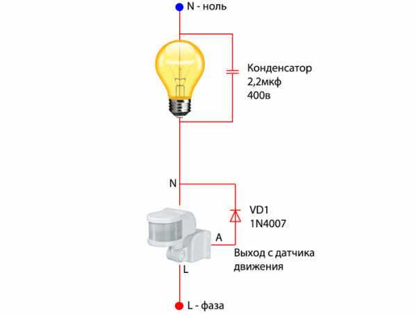 Конденсатор припаивается параллельно лампочке. Схематично получается, что на датчик будет приходить только фаза. Причем заходит на контакт L, а выходит с контакта N.