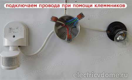 - По выбранному варианту схемы выполнить подключение трех проводов к контактам корпуса датчика и в корпусе прибора освещения. При этом не нужно забывать о соблюдении маркировки по цветам проводов и обозначениях разъемов, во избежание путаницы. При неправильном подключении ноля и фазы вы подвергаете себя опасности, а также навредите электропроводке, поэтому при подключении нужно работать аккуратно и осторожно.