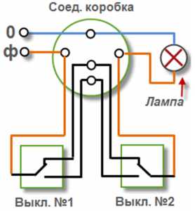 Это самая простая конструкция подобных переключателей. Здесь нулевой (синий) провод приходит в распределительную коробку, а затем идет прямиком на лампу. Фазный кабель (оранжевый) из коробки подводится на входной контакт первого выключателя. Далее, на выходе, два черных кабеля соединяются с соответствующими входными контактами второго выключателя, а потом один провод уже идет на лампу.