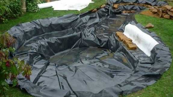 Для обеспечения качественного устройства водоема с гидроизоляцией из пленки сделайте 15-сантиметровую траншею по периметру водного объекта для более надежного закрепления пленки.